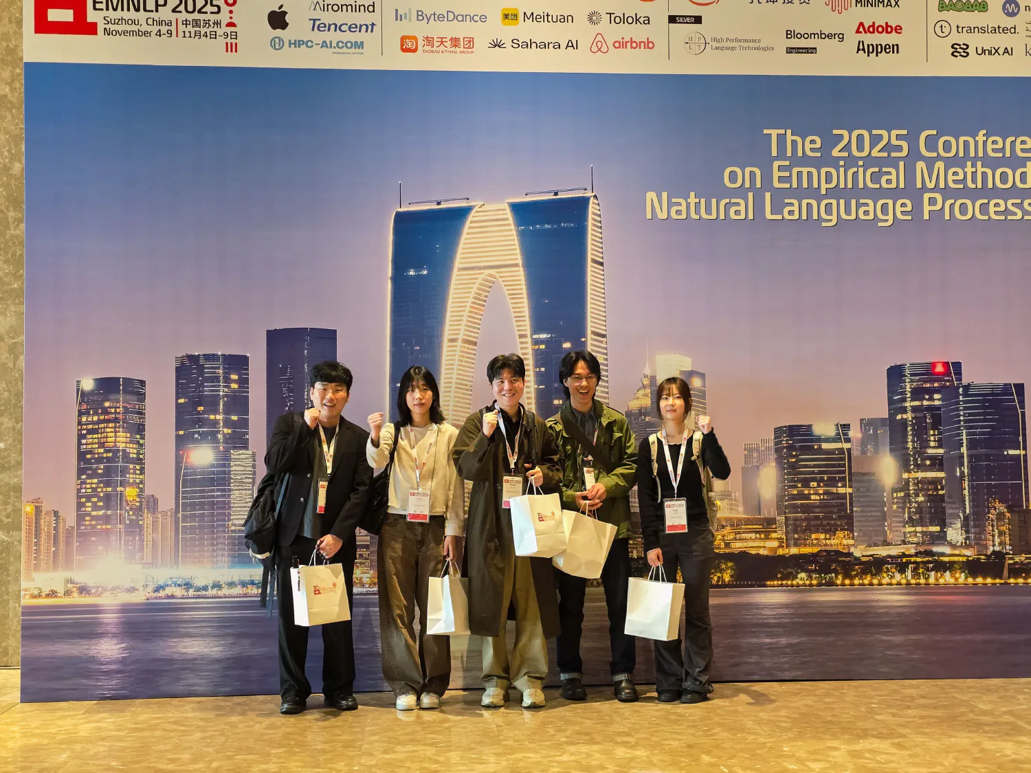 김민석, 정지우, 정승원, 김윤지 학생이 2025년 11월 3일~7일 중국 쑤저우에서 열린 EMNLP 2025에 참여하였습니다.