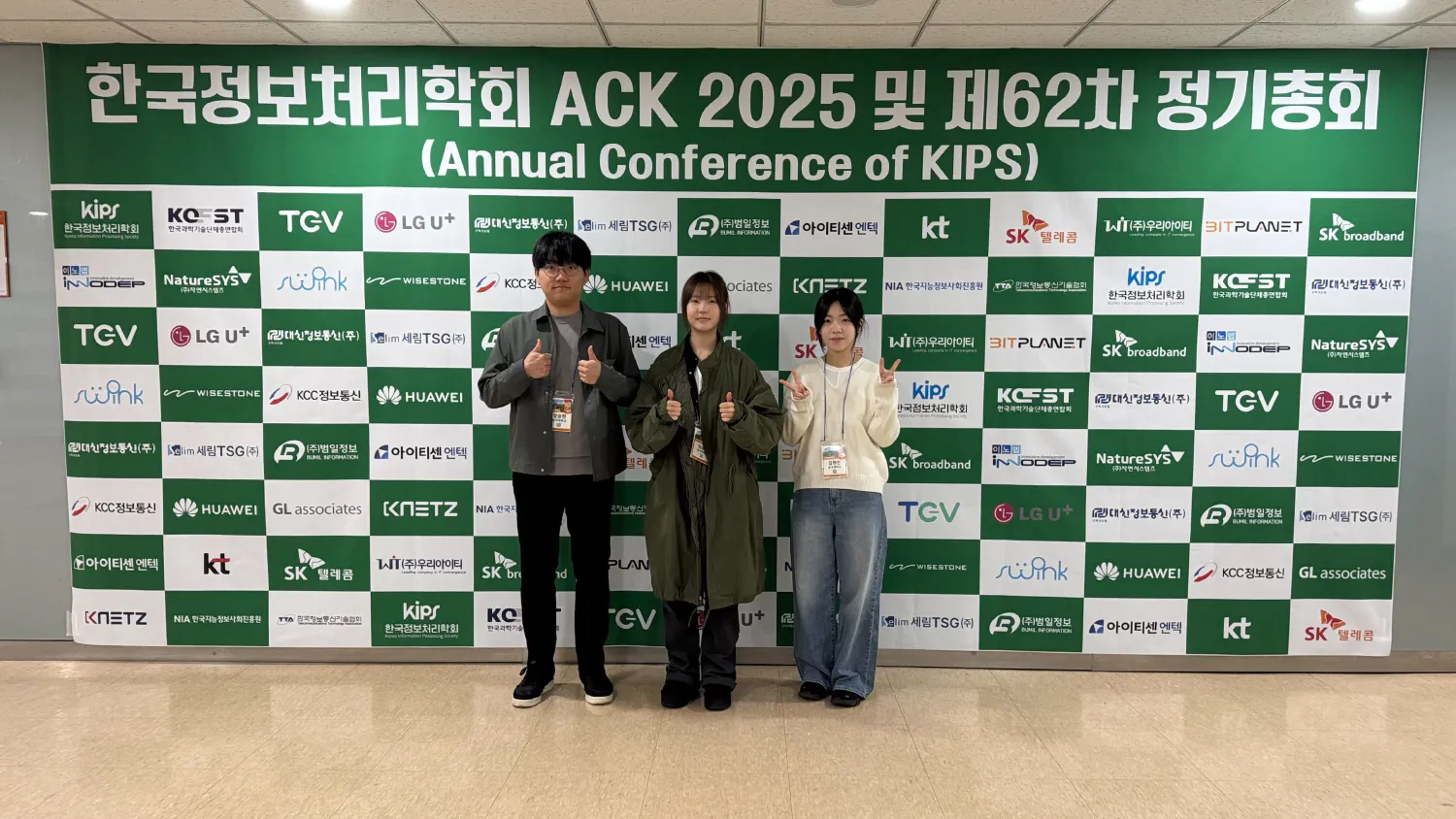 정승현, 김현진, 김윤지 학생이 2025년 11월 6일~8일 동국대학교 서울캠퍼스에서 열린 한국정보처리학회 ACK 2025에 참여하였으며, 정승현 학생이 산학연협동우수상을 수상하였습니다.